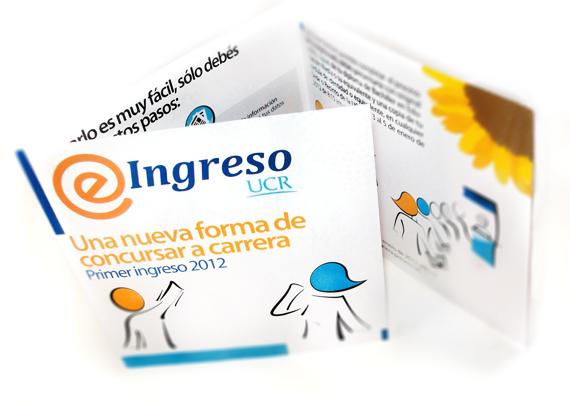 La Universidad de Costa Rica tiene un sistema en línea para que los nuevos estudiantes concursen por su carrera preferida, éste plegable les fue enviado para explicarles el proceso. Las ilustraciones fueron hechas por mí para esta serie de diseños.